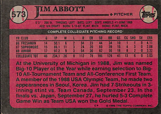 1989 Topps #1 Draft Pick Jim Abbott Baseball Card #573 - Rookie Card - Mint Condition