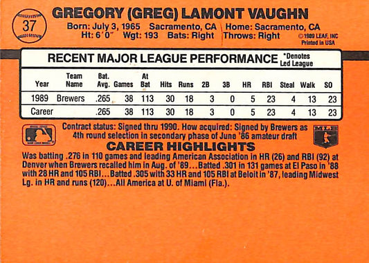 1990 Donruss Greg Vaughn MLB Baseball Error Card #37 - Rated Rookie - Error Card - Mint Condition
