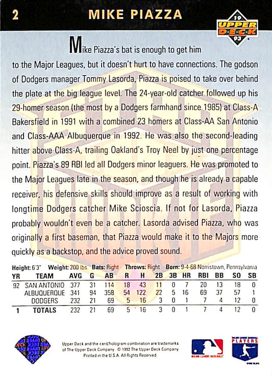 1992 Upper Deck Mike Piazza Rookie MLB Baseball Card #2 - Rookie Card - Mint Condition