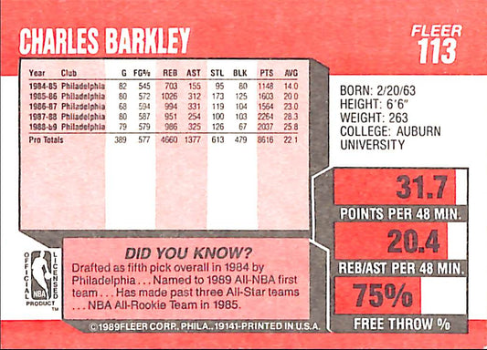 1989 Fleer Vintage Charles Barkley NBA Basketball Card #113 - Mint Condition