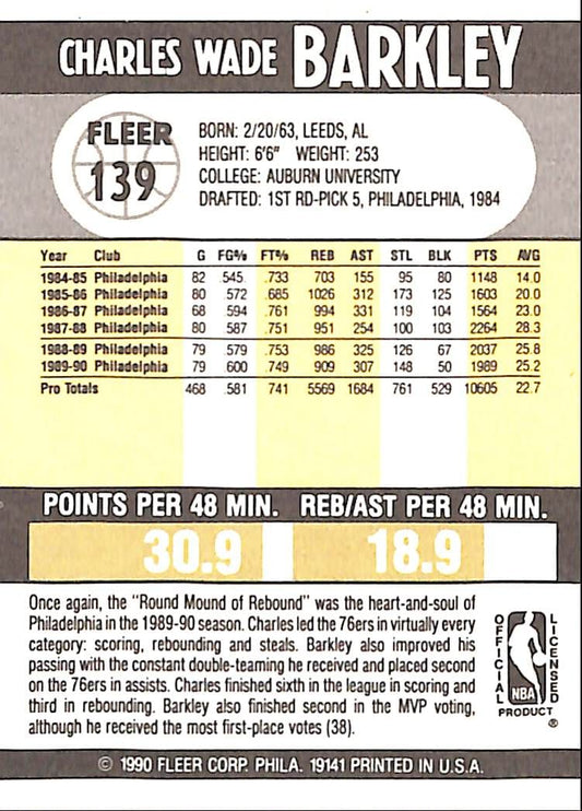 1990 Fleer Vintage Charles Barkley NBA Basketball Card #139 - Mint Condition