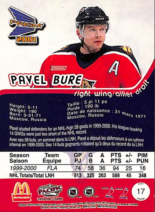 2001 Prism Pavel Bure Hockey NHL Card #17 - Mint Condition