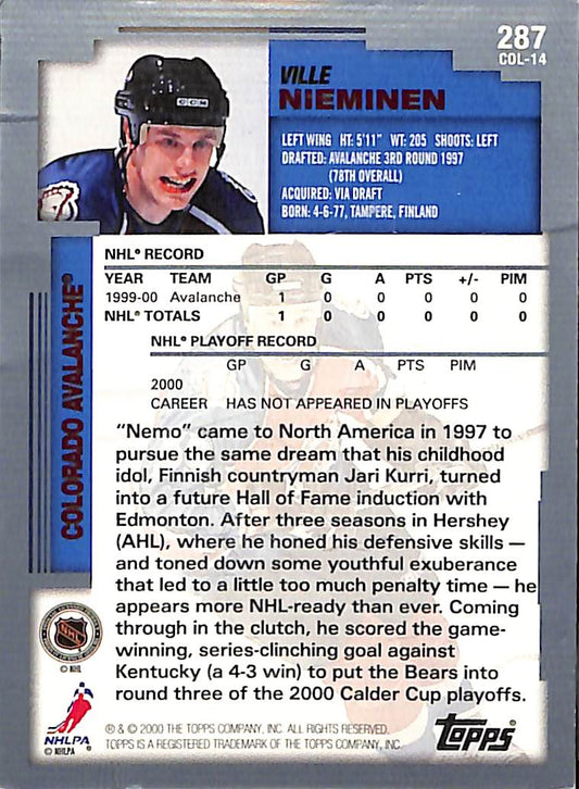 2000 Topps Ville Nieminen Signed NHL Hockey Rookie Card #287 - Signed - Rookie Card - Mint Condition