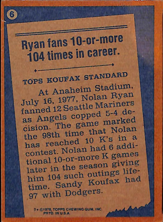 1978 Topps Nolan Ryan Vintage Baseball Card #6 - Mint Condition - Tops Koufax Record