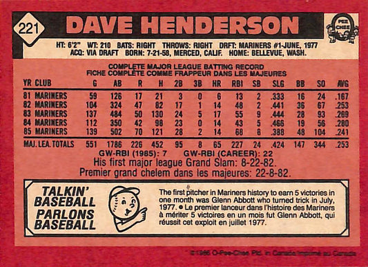 1986 O-Pee-Chee Dave Henderson Vintage MLB Baseball Card #221 - Mint Condition