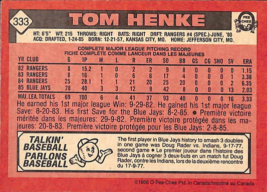 1986 O-Pee-Chee Tom Henke Vintage MLB Baseball Card #333 - Mint Condition