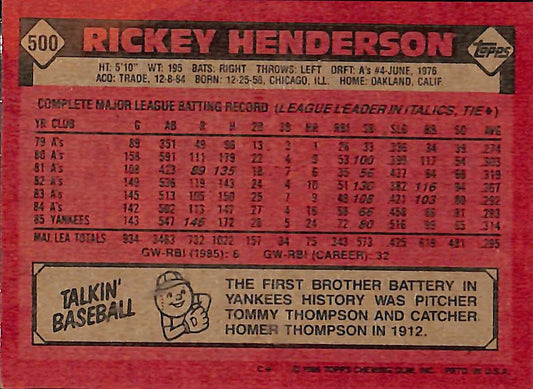 1986 Topps Rickey Henderson Vintage Baseball Card #500 - Mint Condition