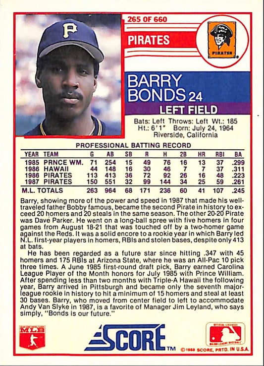 1988 Score Barry Bonds Baseball Card #265 - Mint Condition