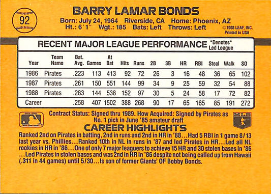 1989 Donruss Barry Bonds Baseball Card #92 - Mint Condition