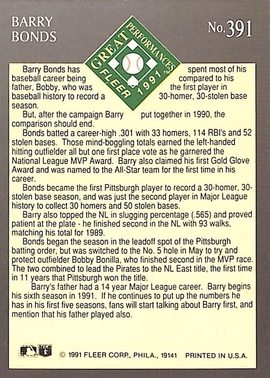 1991 Fleer Great Performance Barry Bonds Baseball Card #391 - Mint Condition