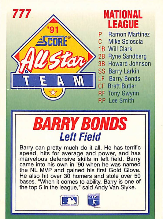 1991 Score All Star Team Barry Bonds Baseball Card #777 - Mint Condition