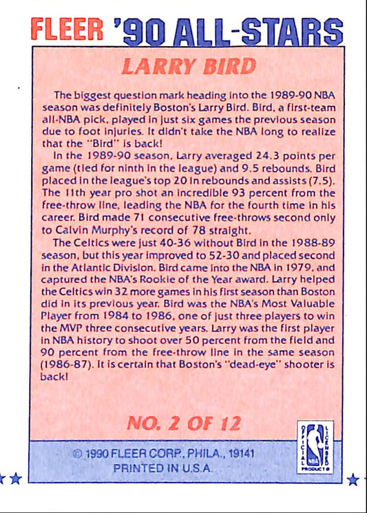 1990 Fleer All Stars Larry Bird NBA Basketball Player Card #2 - Mint Condition