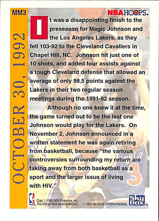 1993 NBA Hoops Magic Johnson Lakers Vs Cleveland Basketball Card #MM3- Mint Condition