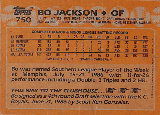1988 Topps Bo Jackson Baseball Card Royals #750 - Mint Condition