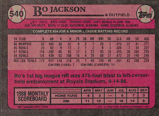 1989 Topps Bo Jackson Vintage Baseball Card Royals #540 - Mint Condition