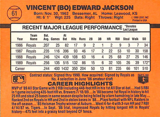 1990 Donruss Bo Jackson All-Star Baseball Card Royals #61 - Error Card - Mint Condition