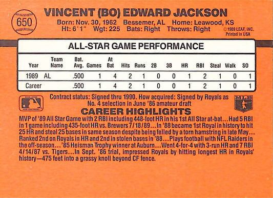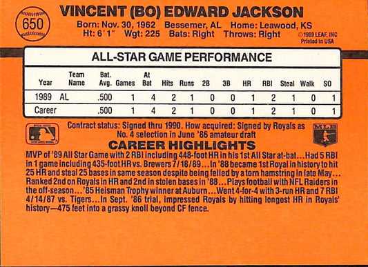 1990 Donruss Bo Jackson All Star Baseball Card Royals #61 - Error Card - Mint Condition