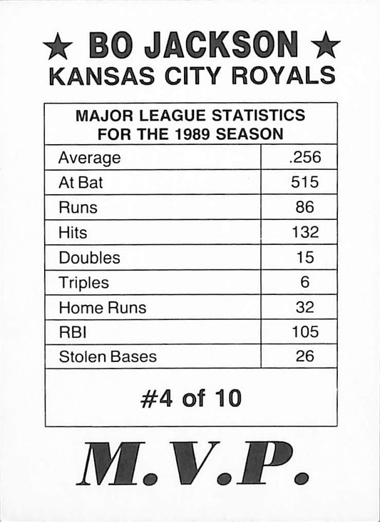 1990 MVP Bo Jackson Baseball Card Kansas City Royals 4 of 10 - Extremely Rare - Mint Condition