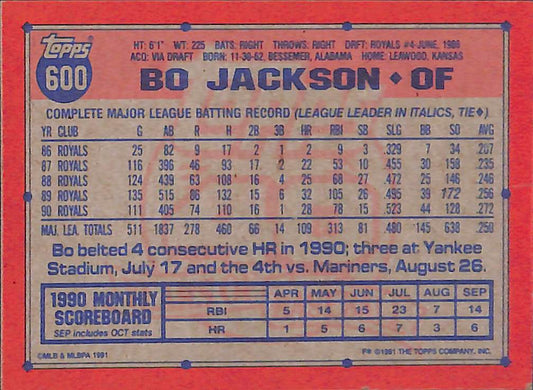 1991 Topps Bo Jackson Baseball Card Royals #600 - Mint Condition