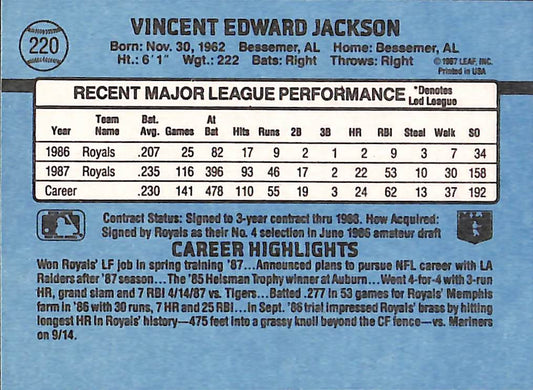 1988 Donruss Bo Jackson MLB Baseball Card Royals #220 - Mint Condition