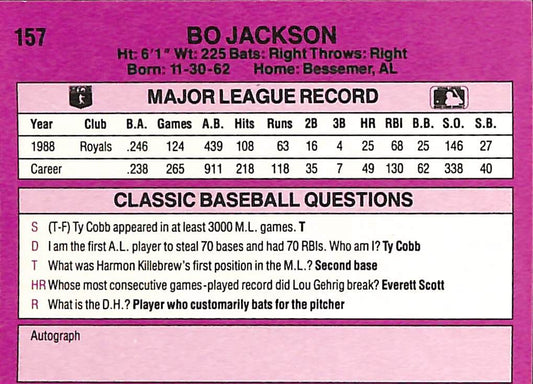1990 Classics Baseball Bo Jackson Kansas City Royals Card #157