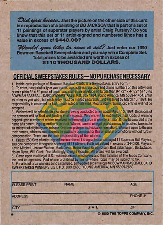 1990 Topps Sweepstakes Bo Jackson Royals Baseball Card #Sweepstakes Card