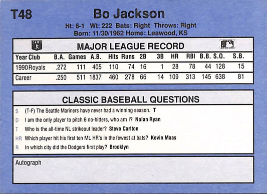 1991 Classics Bo Jackson Baseball Card Royals #T48 - Mint Condition