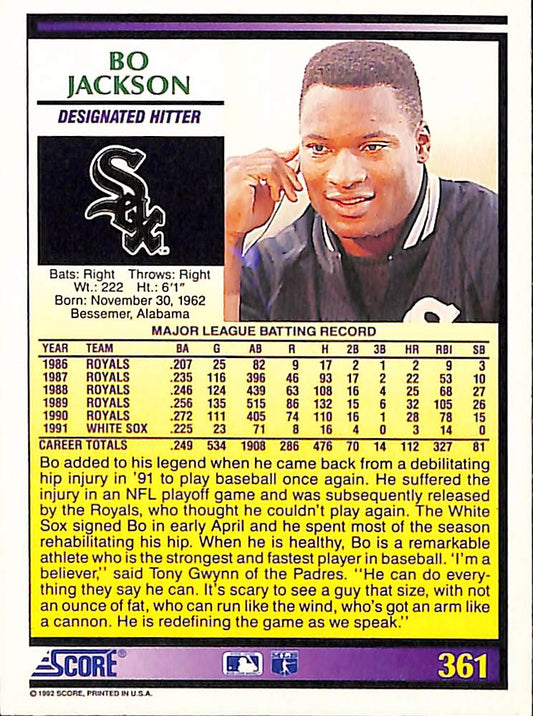 1992 Score Bo Jackson Baseball Card White Sox #361 - Mint Condition