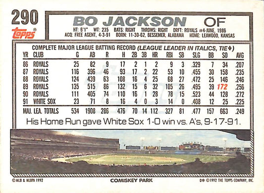 1992 Topps Bo Jackson Baseball Card White Sox #290 - Mint Condition