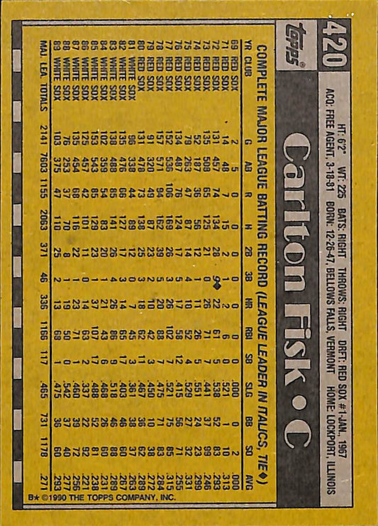 1990 Topps Carlton Fisk Vintage MLB Baseball Card #420 - Mint Condition