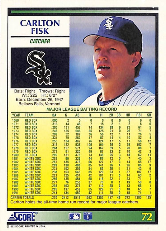 1992 Score Carlton Fisk Vintage MLB Baseball Card #72 - Mint Condition