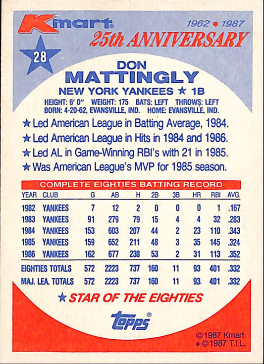 1987 Topps Kmart Vintage Don Mattingly Baseball Card #28 - Mint Condition