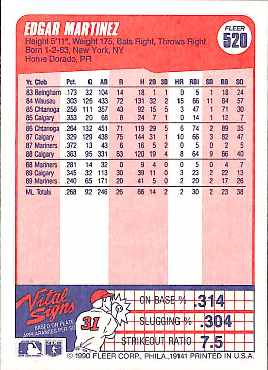 1990 Fleer Edgar Martinez Baseball Card #520 - Mint Condition