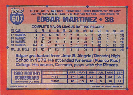 1991 Topps 40 Edgar Martinez Baseball Card #607 - Mint Condition
