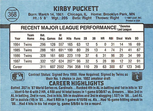 1988 Donruss Kirby Puckett MLB Baseball Error Card #368 - Error Card - Mint Condition