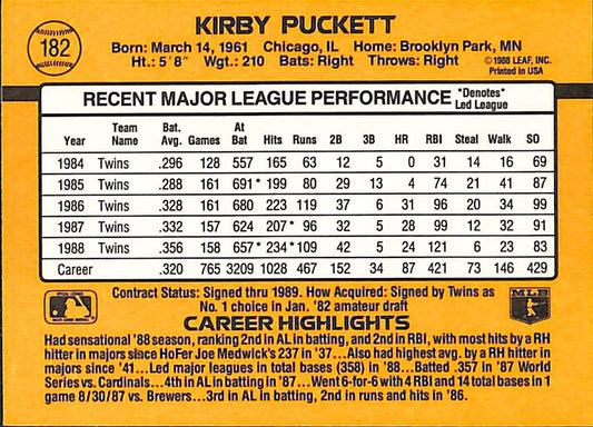 1989 Donruss Kirby Puckett MLB Baseball Error Card #182 - Error Card - Mint Condition