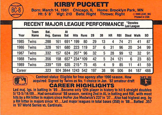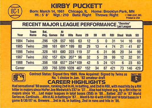 1989 Donruss MVP Kirby Puckett MLB Baseball Error Card #BC-1 - Error Card - Mint Condition