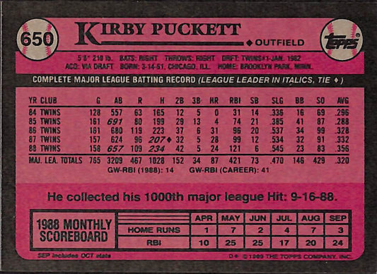 1989 Topps Kirby Puckett MLB Baseball Error Card #650 - Error Card - Mint Condition