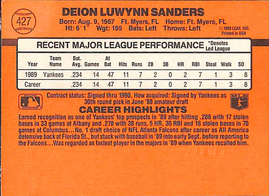 1990 Donruss Deion Sanders Baseball Card #427 - Error Card - Mint Condition