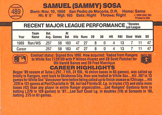 1990 Donruss Sammy Sosa MLB Baseball Player Error Card #489 - Error Card - Mint Condition