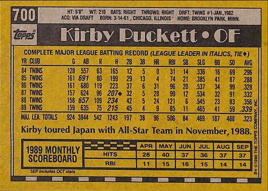 1990 Topps Kirby Puckett MLB Baseball Error Card #700 - Error Card - Mint Condition