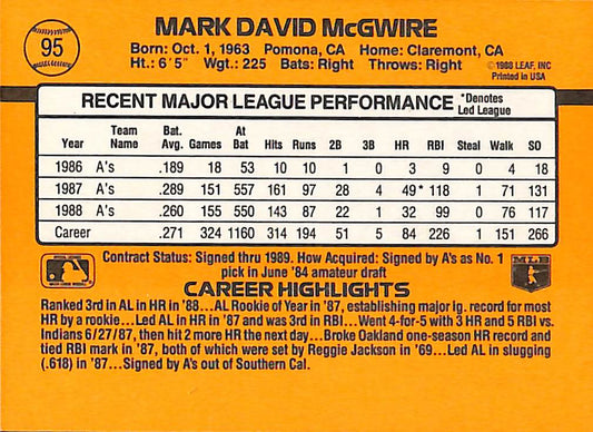 1989 Donruss Mark McGwire Error Baseball Card #95 - Error Card - Mint Condition