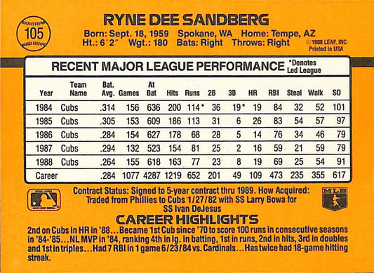 1989 Donruss Ryne Sandberg Baseball Error Card #105 - Error Card