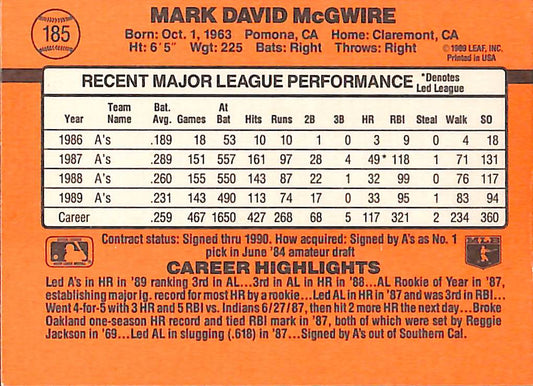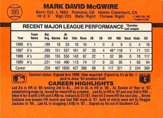 1990 Donrus Mark McGwire Baseball Error Card #185 - Error Card - Mint Condition