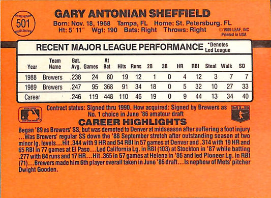 1990 Donruss Gary Sheffield Baseball Player Error Card #501 - Error Card - Mint Condition