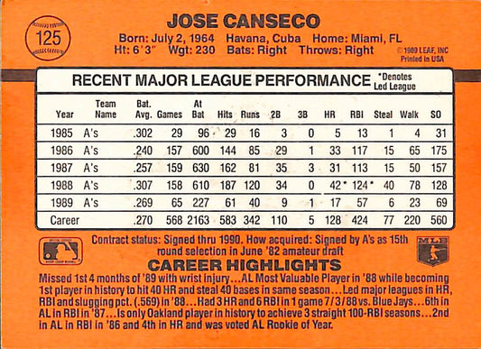 1990 Donruss Jose Canseco Baseball Error Card #125 - Error Card - Mint Condition