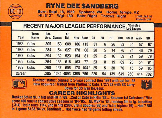 1990 Donruss MVP Ryne Sandberg Baseball Error Card #BC-10 - Error Card - Mint Condition