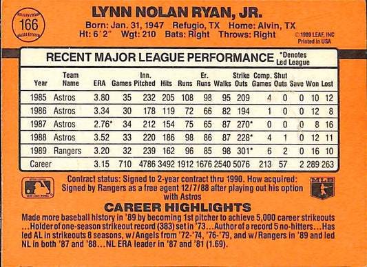 1990 Donruss Nolan Ryan Baseball Error Card #166 - Error Card - Mint Condition