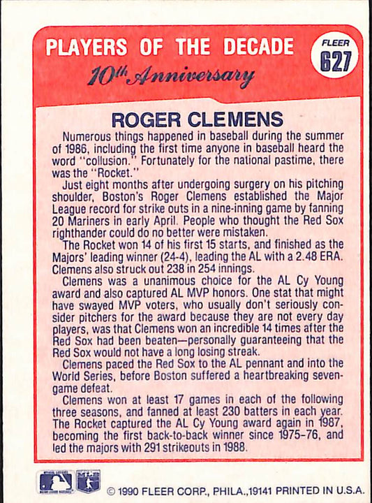 1990 Fleer Players of the Decade Roger Clemens Baseball Error Card #627 - Miss Cut - Mint Condition