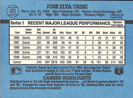 1991 Donruss Jose Uribe Baseball Error Card #375 - Double Error Card - Mint Condition